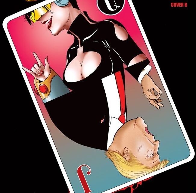 The launch issue will include two covers, both by Robinson, with Cover B serving as a ‘Joker’ playing card, depicting both Bomb Queen and the (current) president.