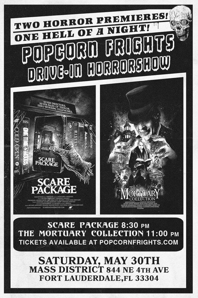 The automobile movie-viewing experience will take place at various drive-in theaters throughout South Florida. Attendees are encouraged to practice social distancing in sporting masks when going to concessions, as well as having wipes handy. The first event on the docket will include the state premieres of both Scare Package and The Mortuary Collection, two horror anthology films.